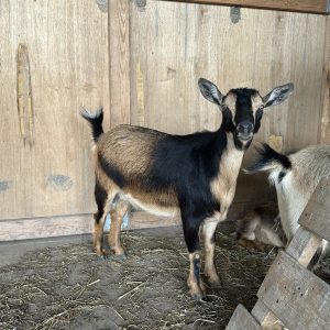 $150.00“Ringer” is a tri-colored, horned, unregistered buckling with blue eyes. His genetics are 7/8 Nigerian Dwarf, 1/8 Nubian. Born 3/13/24.