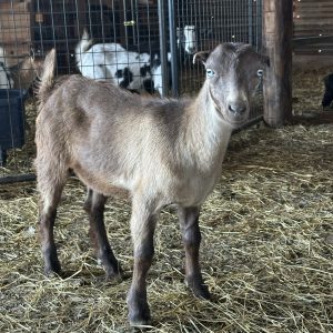$250.00“Blackberry” is a chocolate colored, naturally polled, unregistered buckling with blue eyes. His genetics are 7/8 Nigerian Dwarf, 1/8 Nubian. Born 3/13/24.