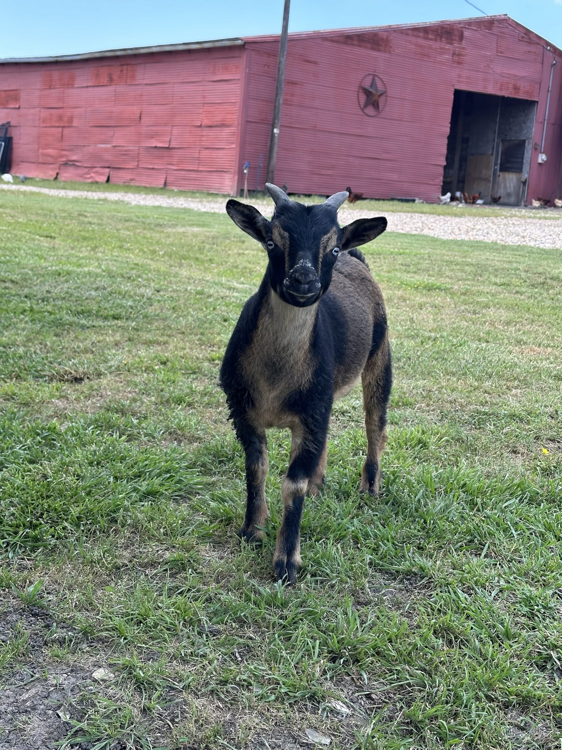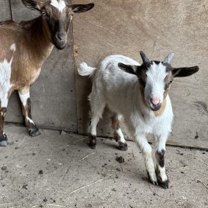 “Ringer” is a tri-colored, horned, unregistered buckling with blue eyes. His genetics are 7/8 Nigerian Dwarf, 1/8 Nubian. Born 3/13/24.