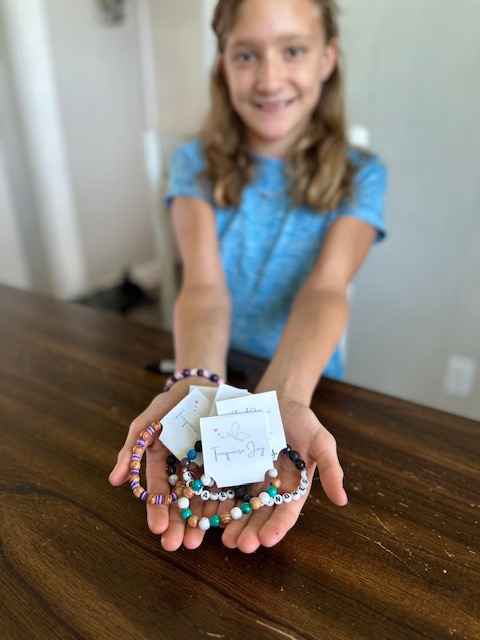 Turquoise Joy is the business of our twelve year old daughter, Ainsley. Ainsley began making diffuser jewelry as a fun way to diffuse essential oils in 2021 and quickly made a business out of it. In 2023, Ainsley began selling her bracelets at the local farmer’s market and inside of boutique retailers like Booth’s Brew in Denison, Texas. Since beginning her business, Ainsley has sold dozens of bracelets across the north Texas region and now has customers all across the United States.